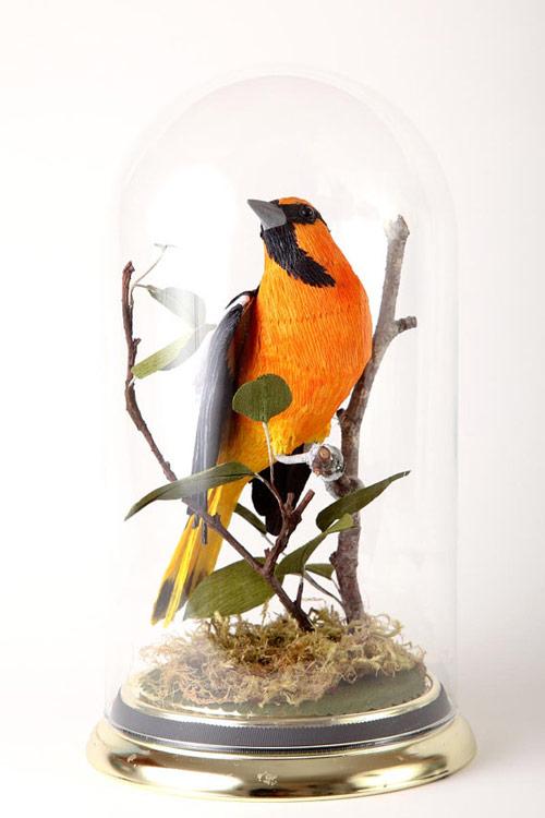 Эми технически не занимается таксидермей, он является строгим вегетарианцем, поэтому ее творения - кулики, вороны, совы, хищные и вымершие птицы, а также растения - сделаны полностью без материалов животного происхождения. Вместо этого она использует гофрированную бумагу, клей, найденные объекты и проволоку.